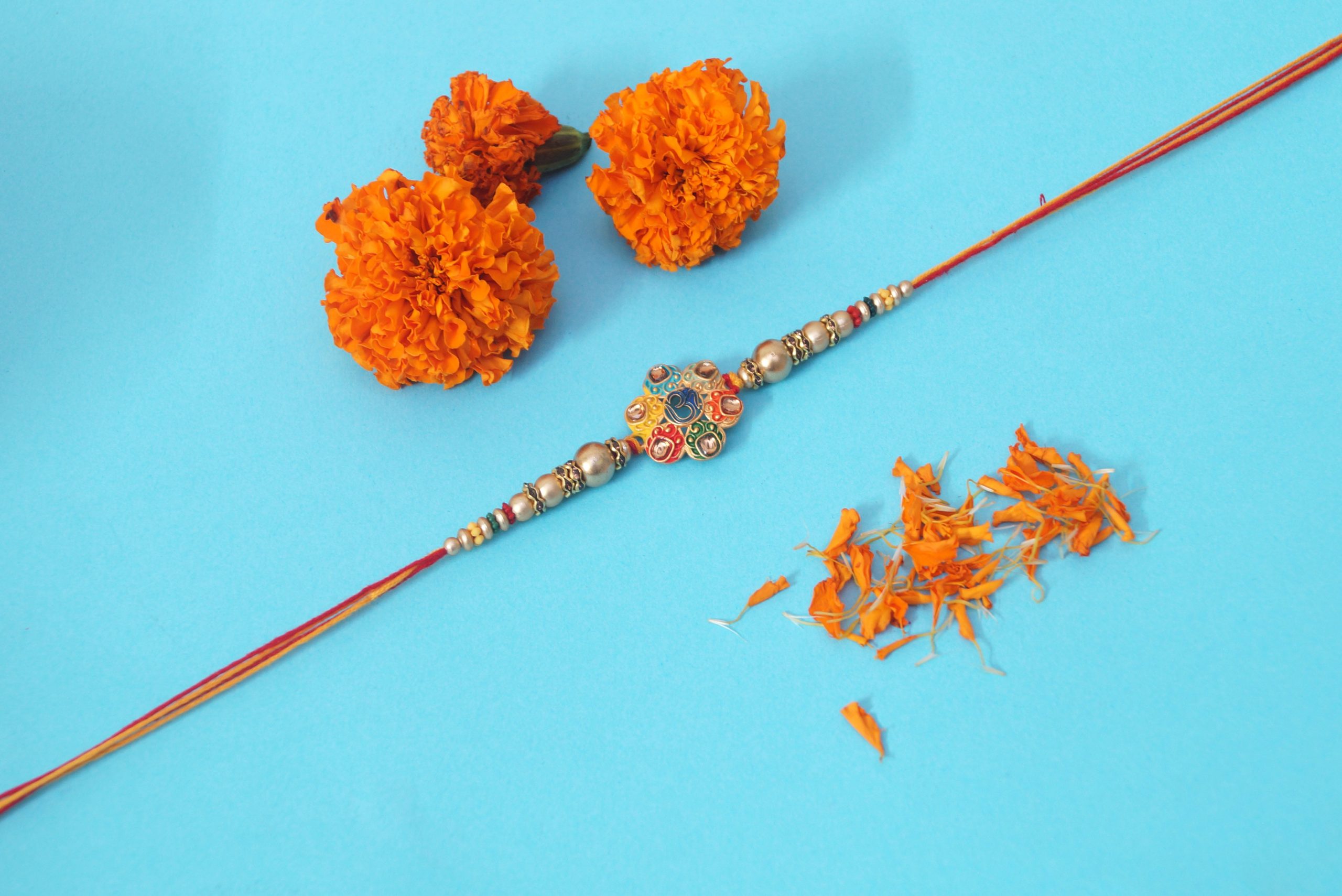 Category: Rakhi Tags: meenakari, pearls, rakhi