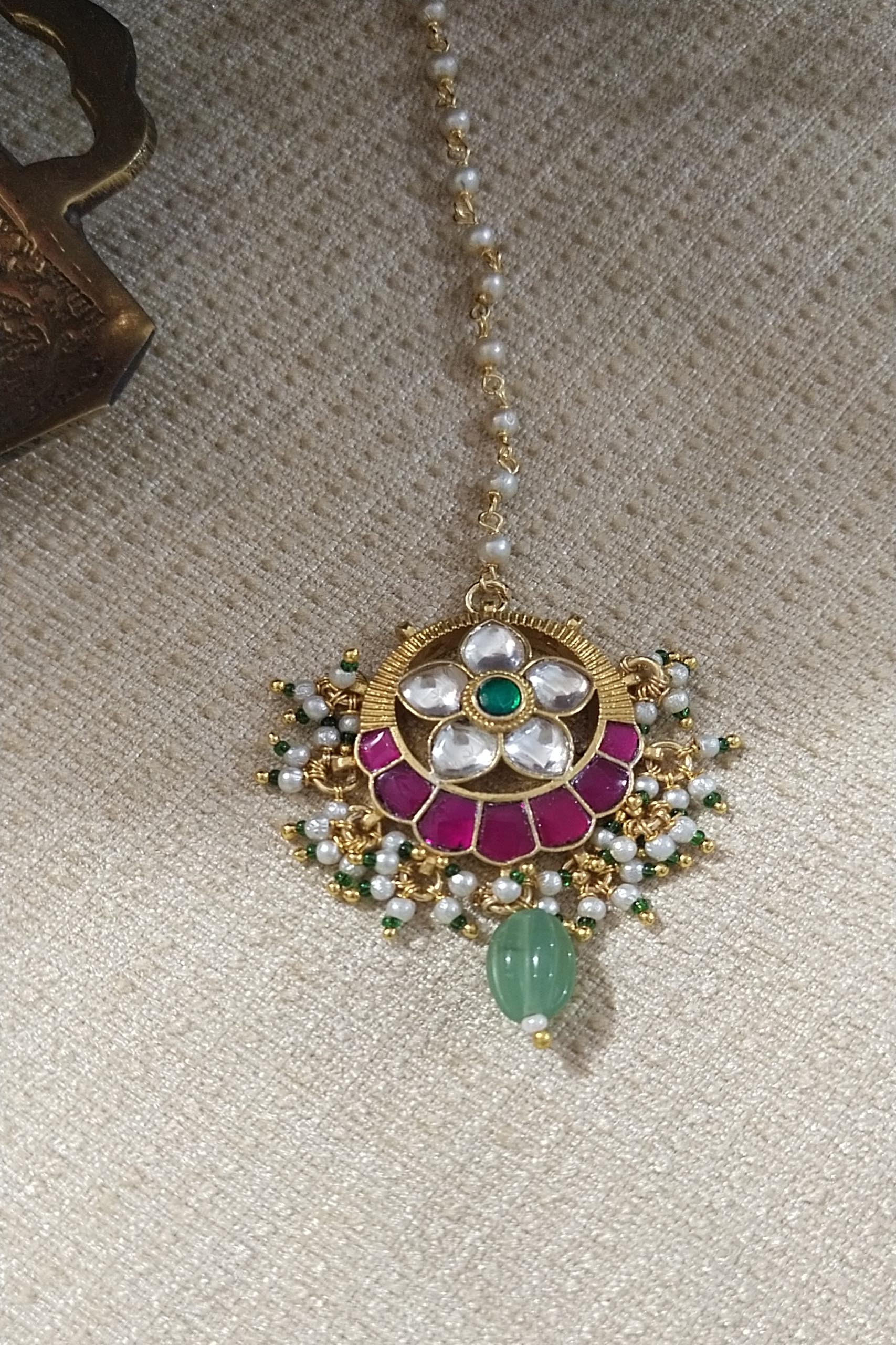 Category: Head Accessories Tags: kundan, maang tikka, paachi kundan, pearl, semi precious stones
