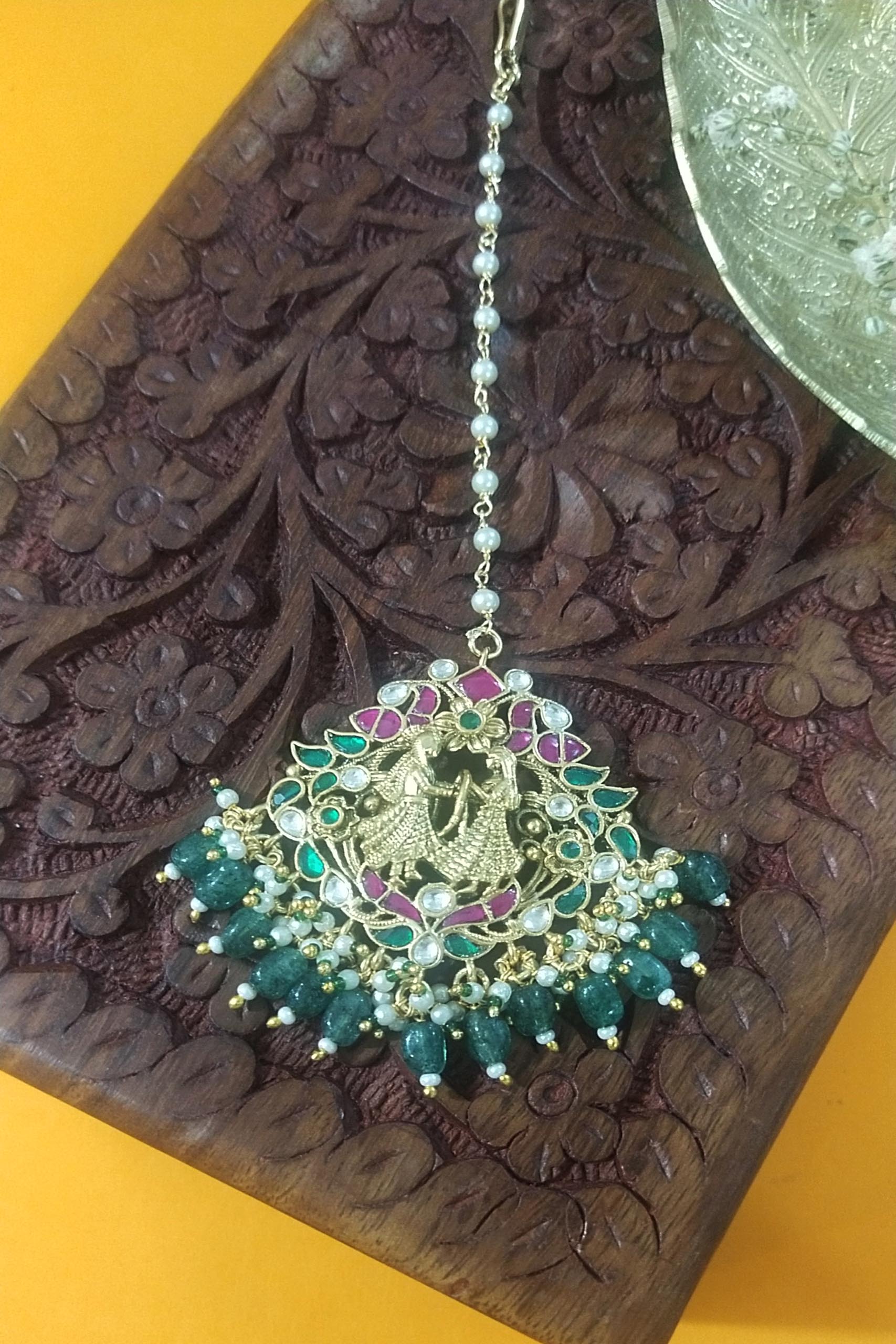 Category: Head Accessories Tags: kundan, maang tikka, paachi kundan, pearls, semi precious stones