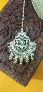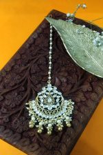 Category: Head Accessories Tags: kundan, maang tikka, paachi kundan, pearl, semi precious stones