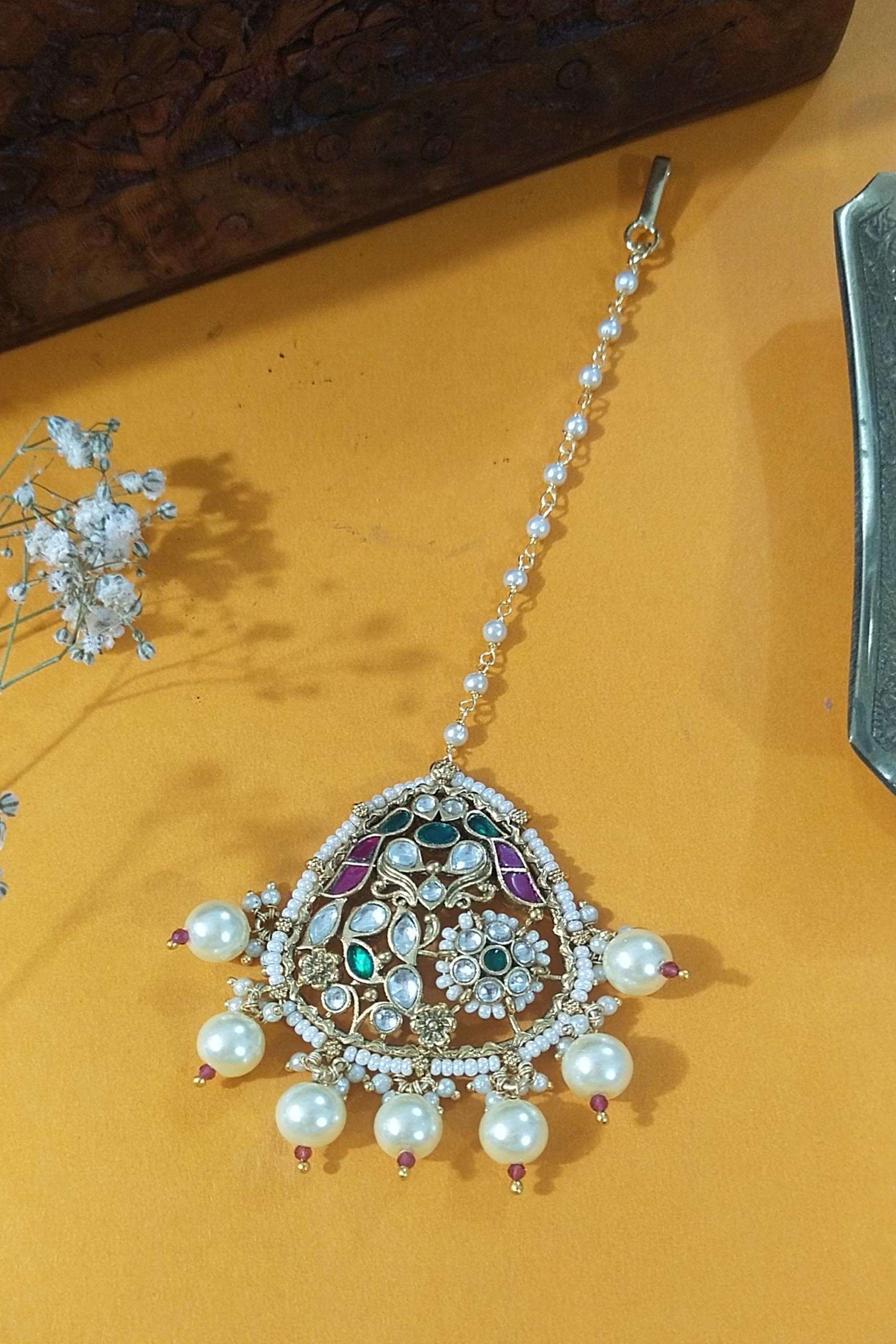 Category: Head Accessories Tags: kundan, maang tikka, paachi kundan, pearls, semi precious stones