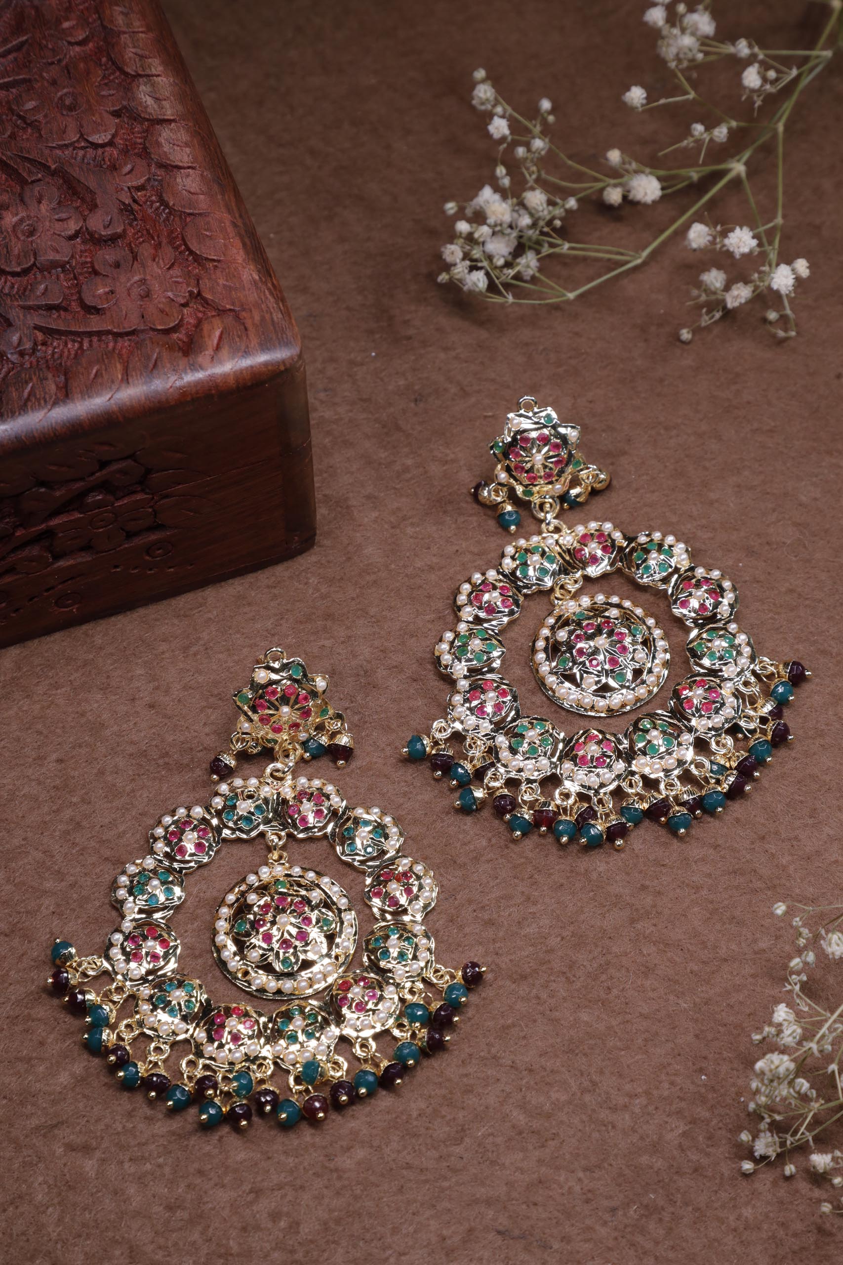 Categories: Earrings, Traditional Jadau Collection Tags: earrings, Jadau, pearls, semi precious stones