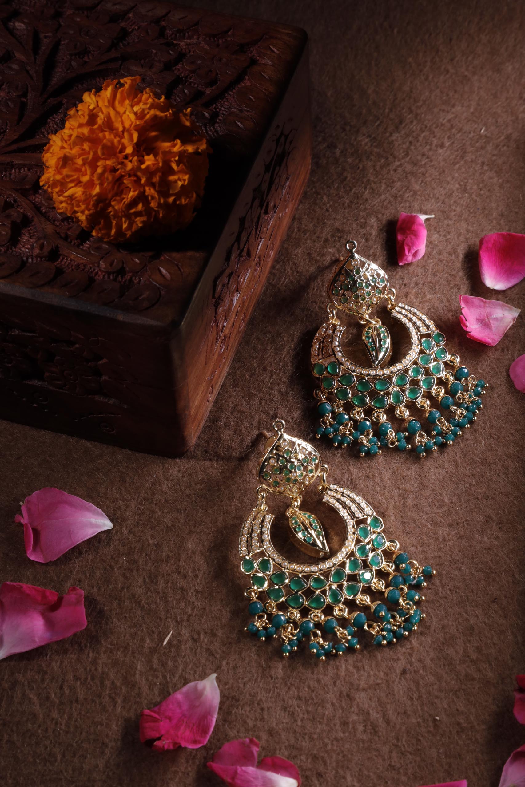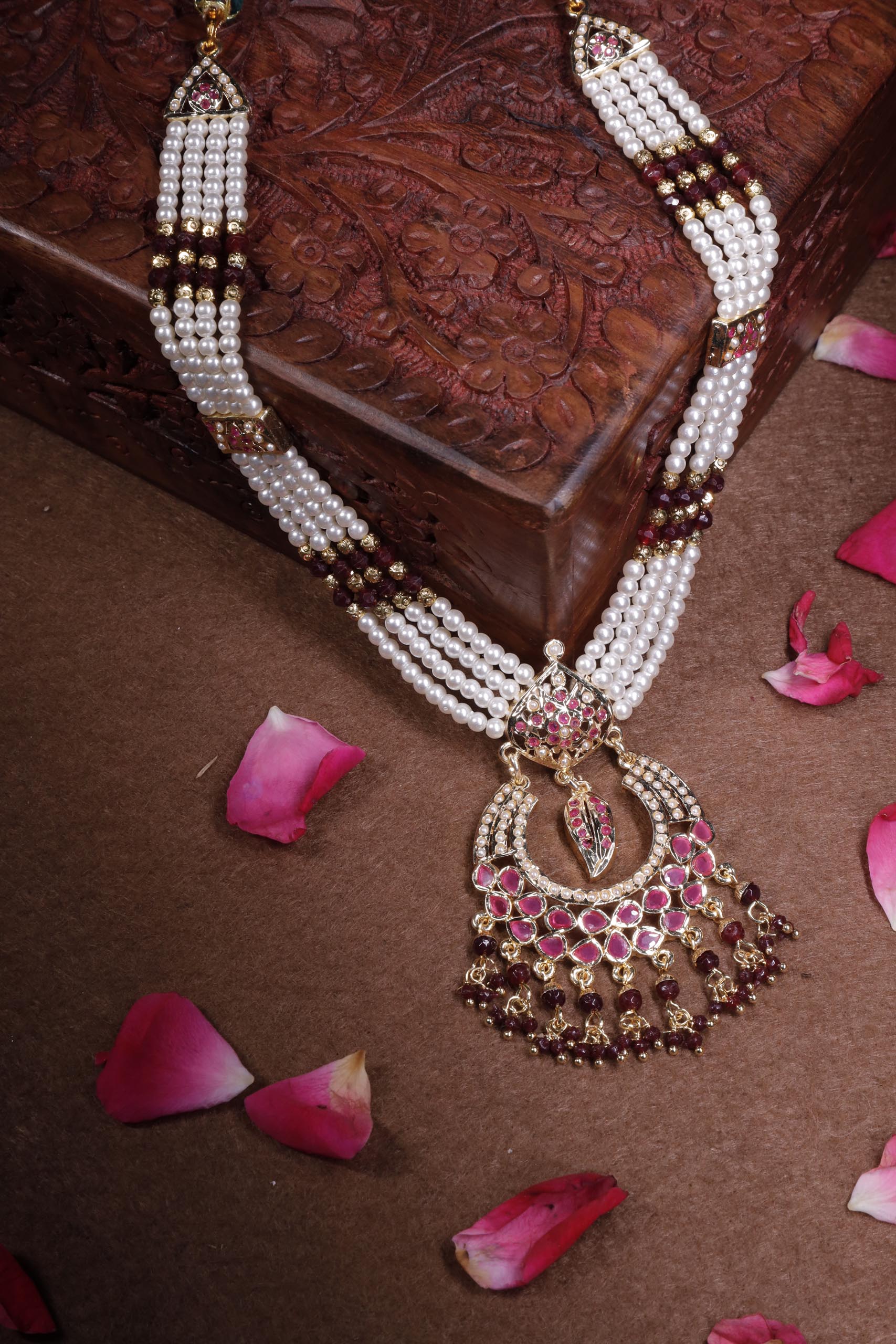 Distinct from Kundan or Polki styles, traditional Jadau jewellery is defined by its exquisite jadaI—delicate strings of pearls or beads meticulously hand-woven over a crafted base. This intricate detailing adds depth, richness, and movement to each piece, creating jewellery that feels both regal and timeless. A true celebration of heritage artistry, Jadau work remains a favorite for bridal and ceremonial wear.