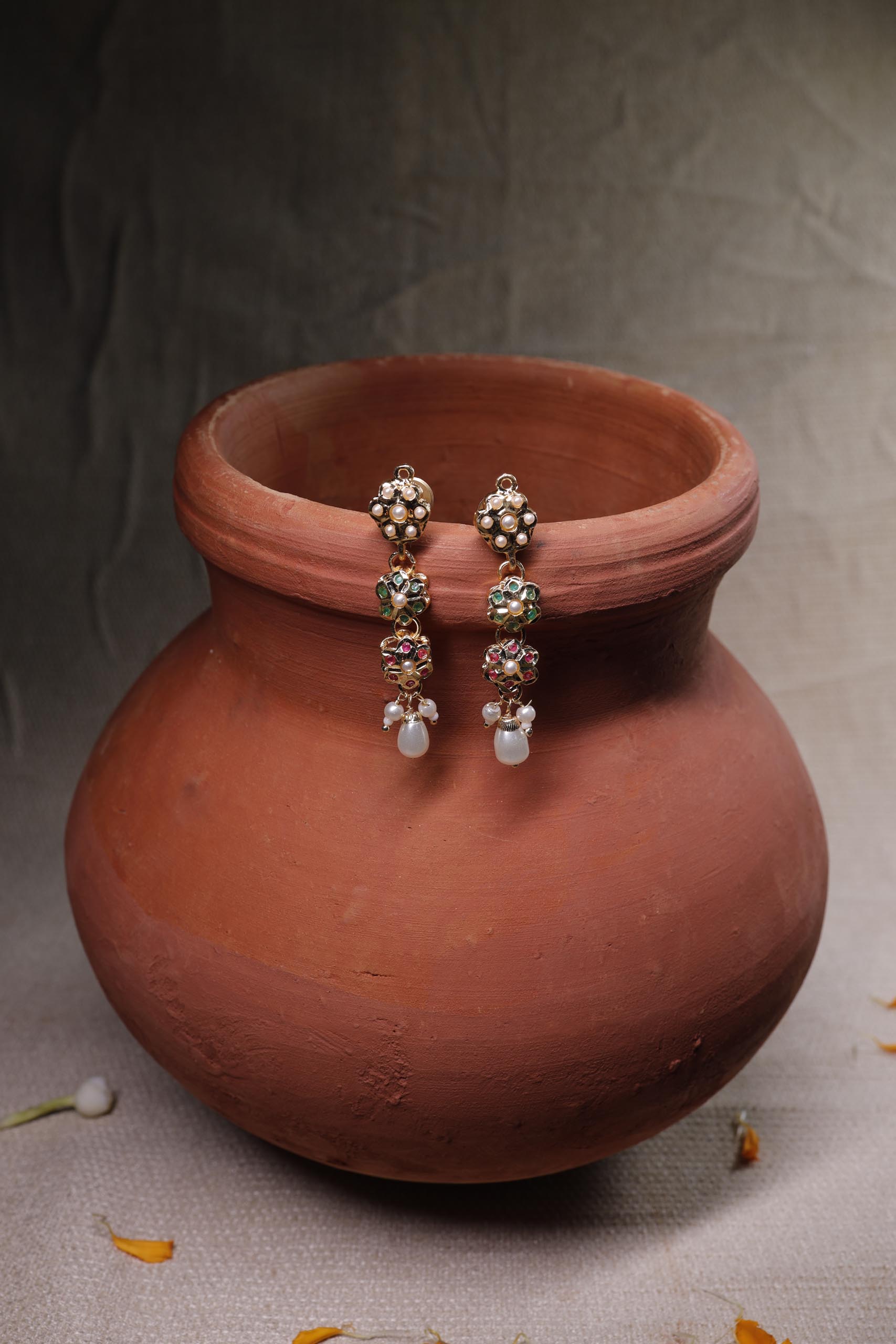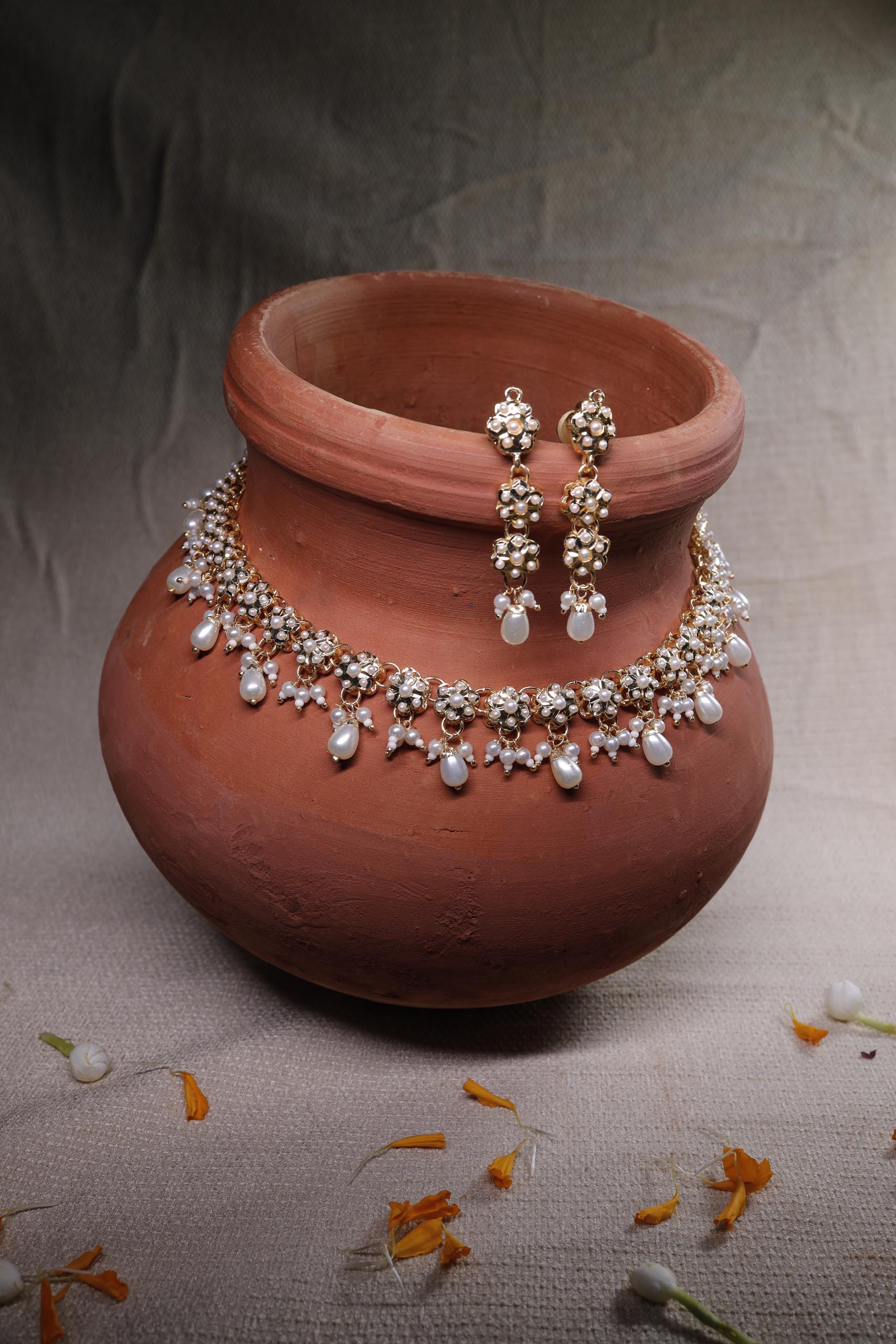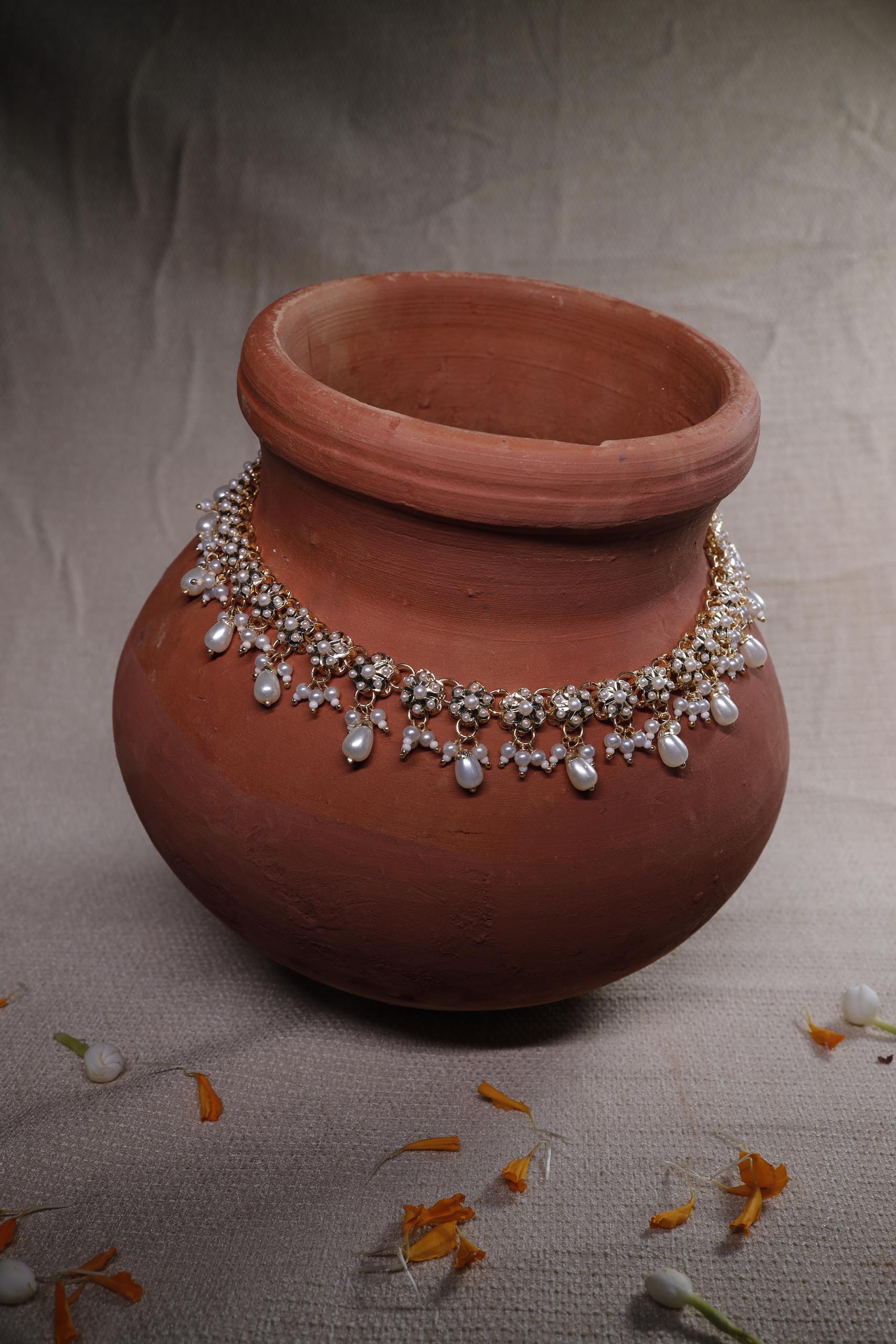 Distinct from Kundan or Polki styles, traditional Jadau jewellery is defined by its exquisite jadaI—delicate strings of pearls or beads meticulously hand-woven over a crafted base. This intricate detailing adds depth, richness, and movement to each piece, creating jewellery that feels both regal and timeless. A true celebration of heritage artistry, Jadau work remains a favorite for bridal and ceremonial wear.